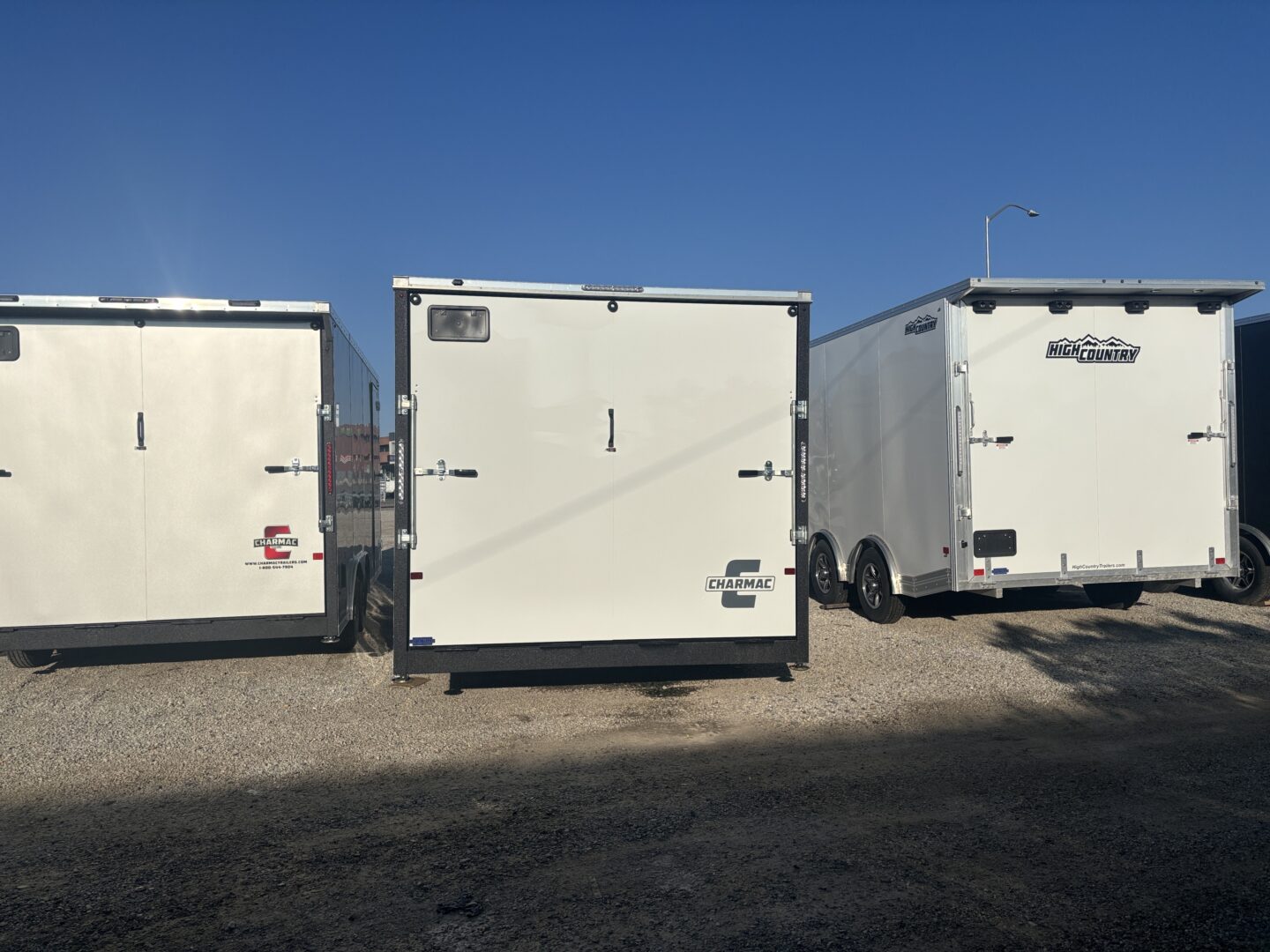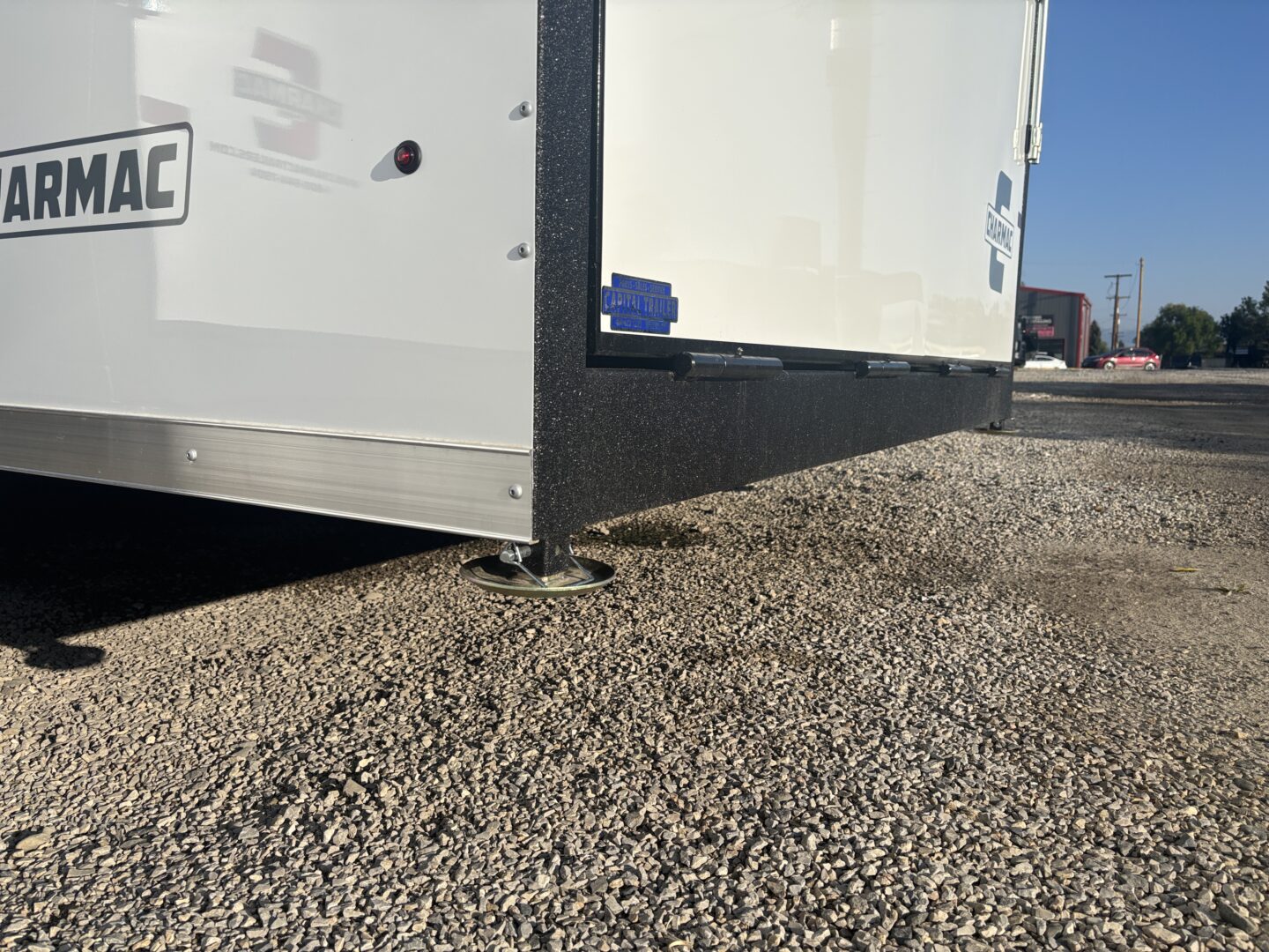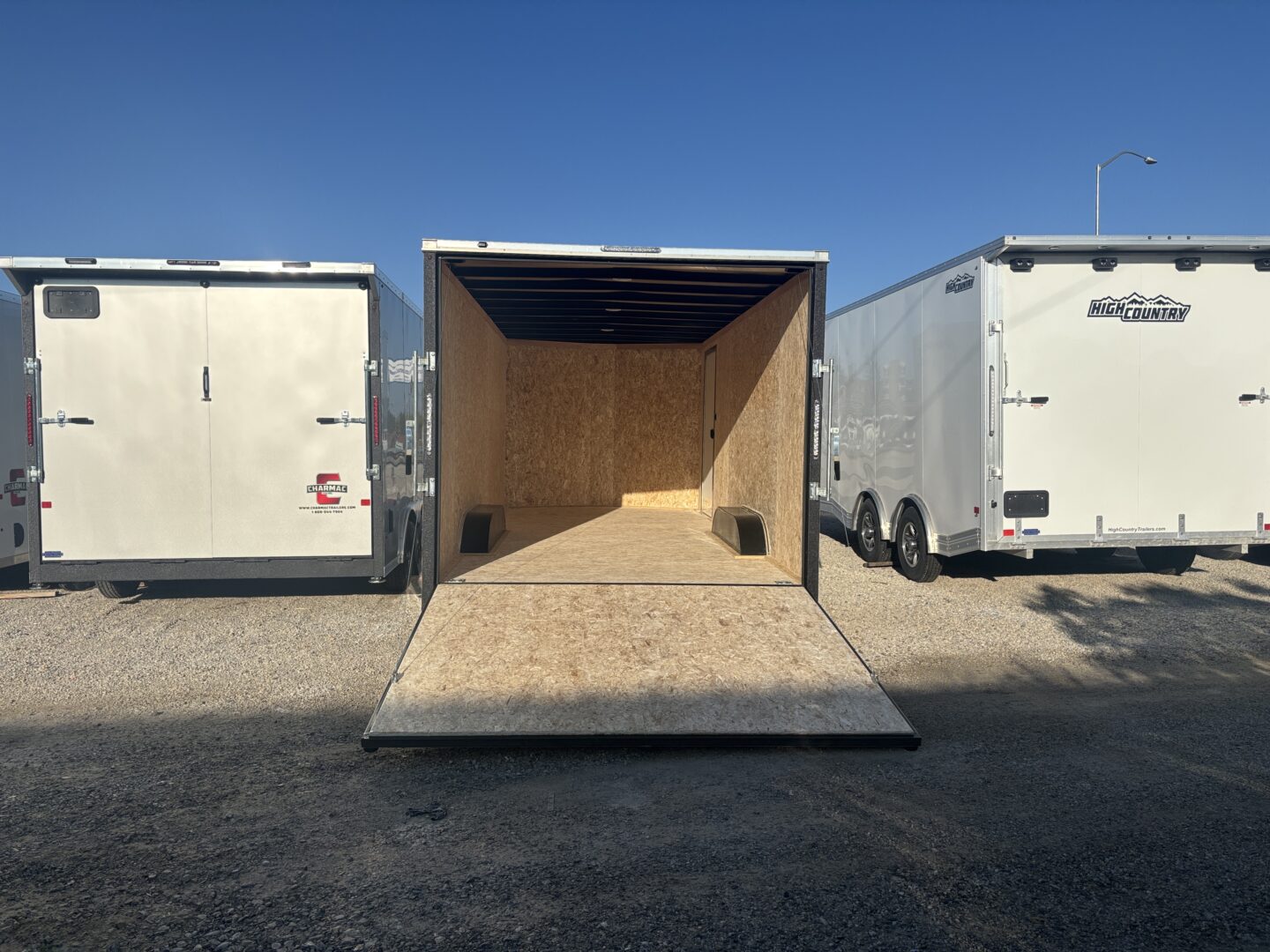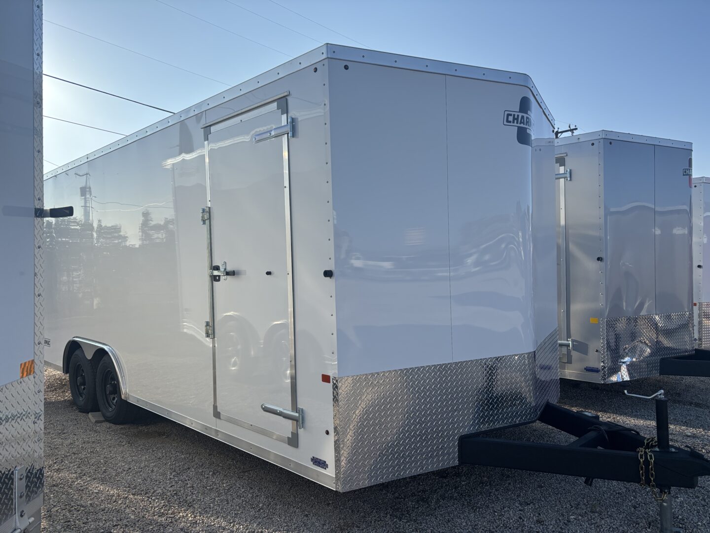 This Stealth V-Nose car/UTV hauler blends the polished Charmac finish with everyday practicality. The spring-assist rear ramp speeds loading, the RV-style side door with window adds easy access, and the 7′ interior height gives room for taller rigs. Built with 16″ on-center framing and a one-piece roof, it tows confidently on 5,200-lb axles with electric brakes.